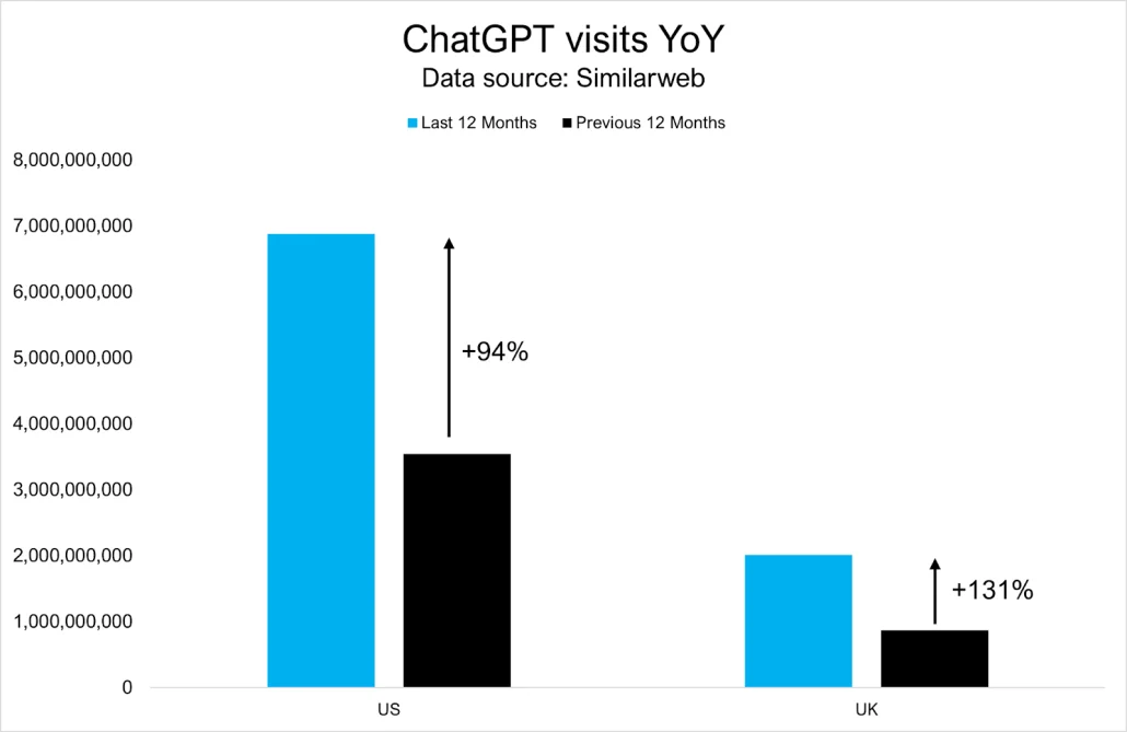En USA, Chat GPT se estima que ha tenido un crecimiento en consultas del 94% y de un 131% en UK.