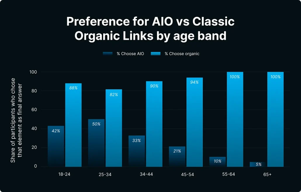 El público de mayor edad aún depende en gran medida de los resultados orgánicos clásicos. Los grupos demográficos más jóvenes tienden a centrarse en la AIO y validar con Reddit.