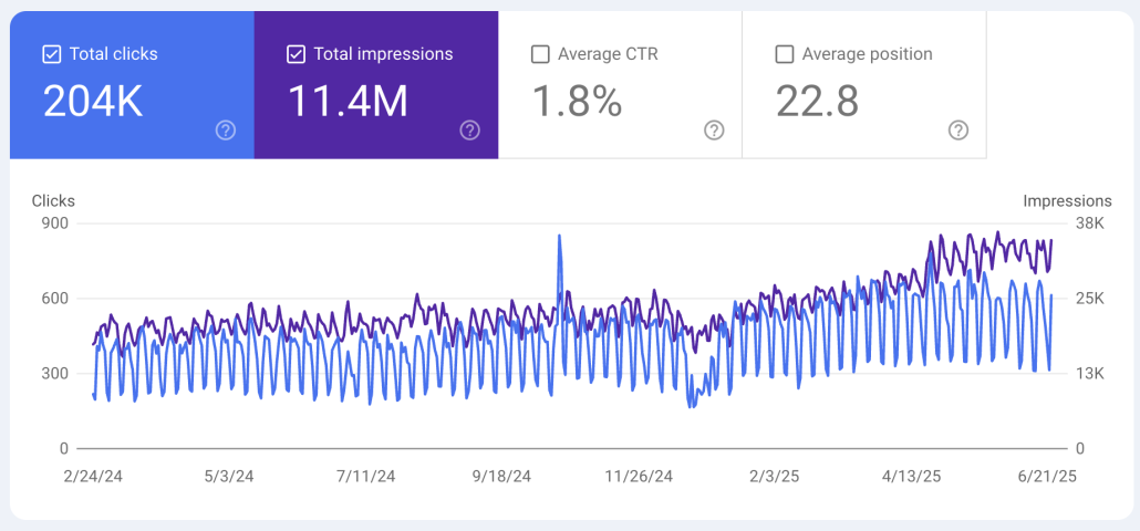 Este despliegue marca un antes y un después para muchos creadores de contenido. Estos resúmenes de IA comienzan a mostrarse en un número creciente de consultas informativas. La consecuencia que vemos en nuestros GSC: un descenso de los clics de entre el 30% y en algunos casos hasta el 50%, mientras las impresiones crecen.