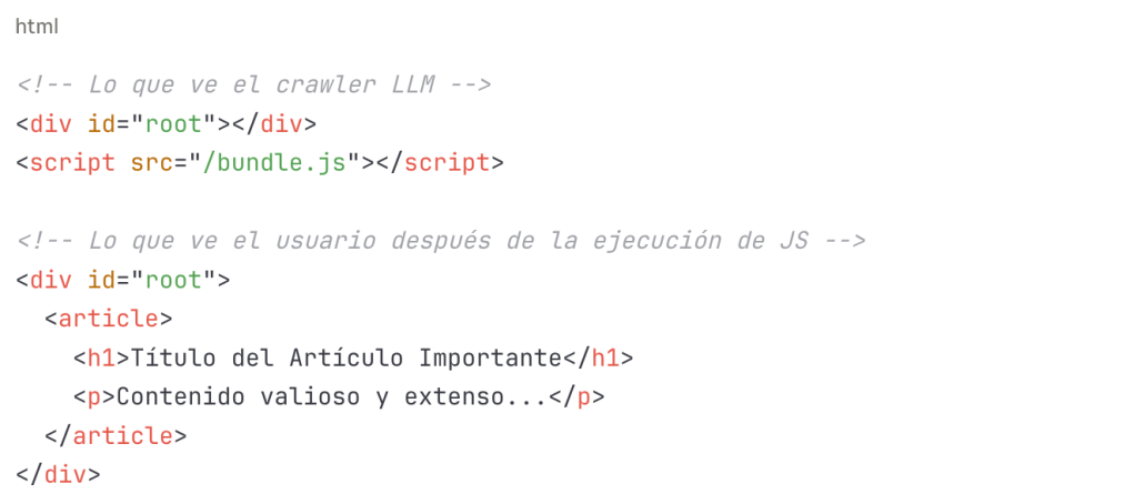 Para un crawler LLM, la página aparece prácticamente vacía, aunque para el usuario muestre información original y valiosa.