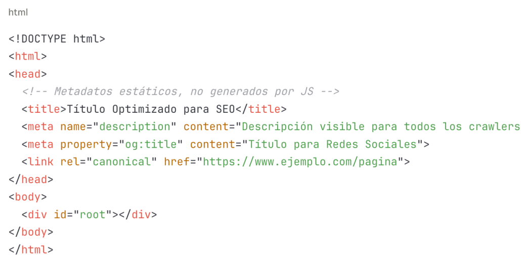 - Redes sociales: Necesitan metadatos específicos y a menudo no ejecutan JS