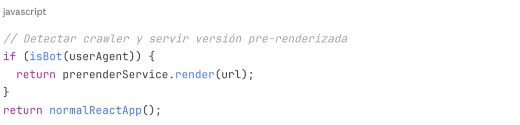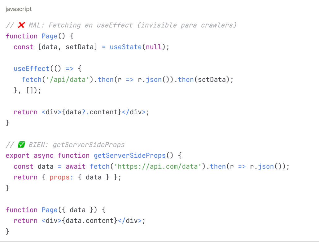 Este patrón, muy común en aplicaciones React o Vue, resulta completamente invisible para crawlers que no ejecutan JavaScript.