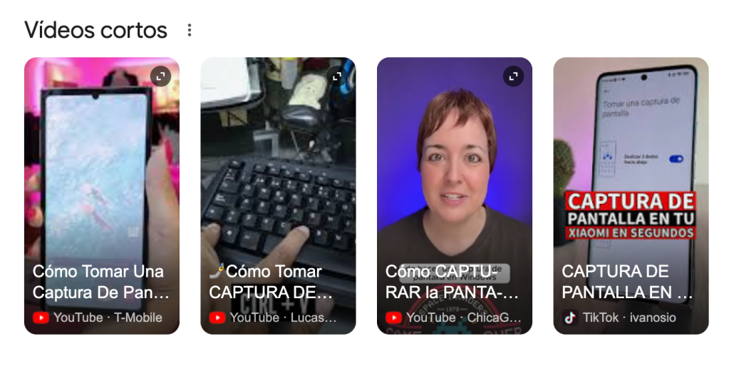 Si bien es cierto que YouTube prefiere los videos largas ( más posibilidades de colocar anuncios), en las últimas actualizaciones de sus listas de resultados ha creado la sección «Videos Cortos «( suponemos que debido al incremento de este tipo de videos en Instragrma, TikTok,…) que muestran resultados de video de estas redes, sino hay de Youtube.